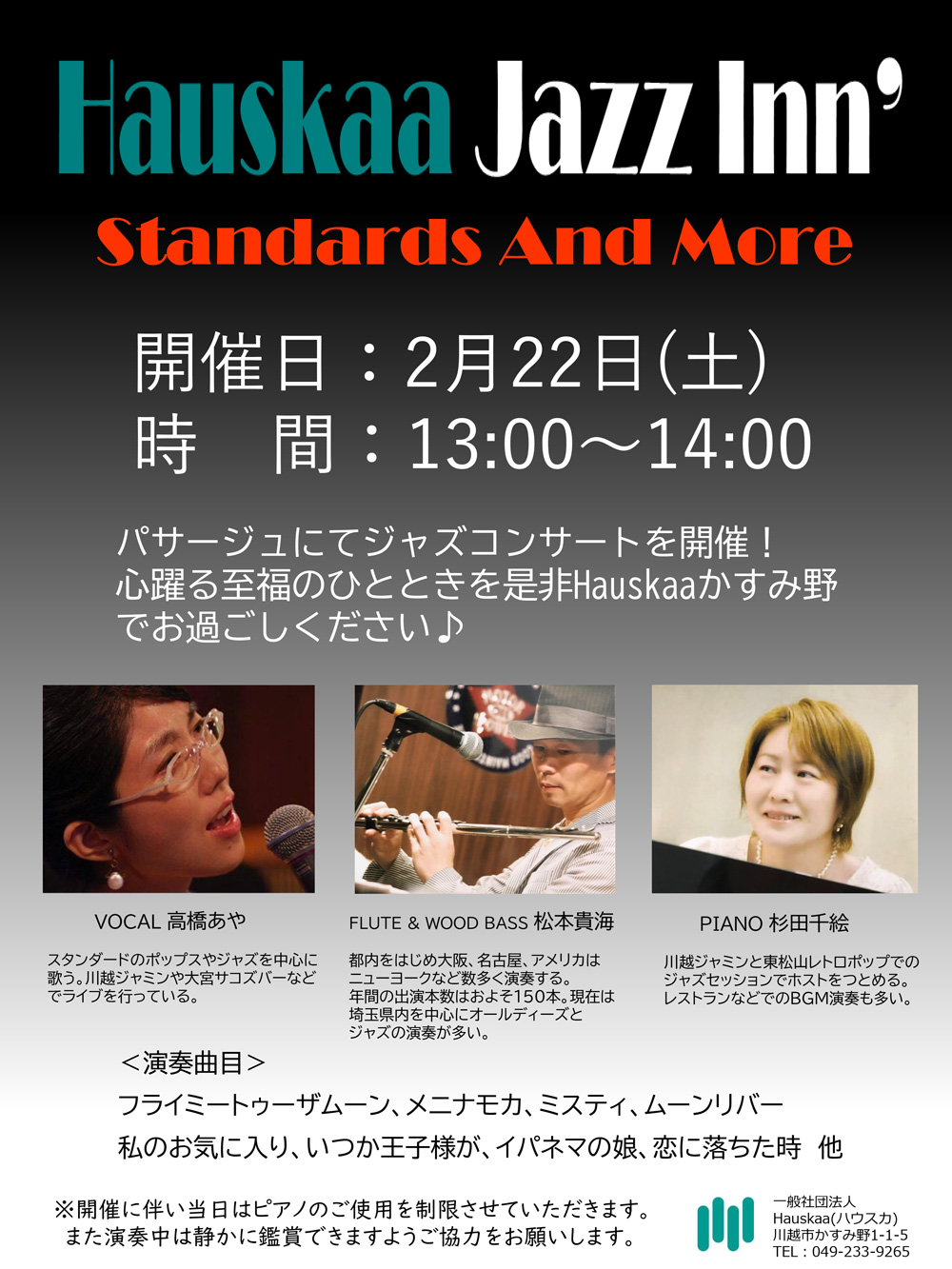 News HOME > NEWS > 【2/22(土).23(日)】パサージュにてJAZZコンサートを行います! [2020年1月25日] 【2/22(土).23(日)】パサージュにてJAZZコンサートを行います! 2/22(土)と2/23(日)の2日間、1階ロビーのパサージュにて JAZZコンサートを行います! 懐かしい映画やミュージカルの音楽から唱歌まで、ご存知の曲ばかりをJAZZのテイストにアレンジしてお届けします。ぜひ足をお運びください! 2日間の出演者、演目等の詳細は下記にてご確認くださいますよう、お願い申し上げます。 « 前の記事 次の記事 »